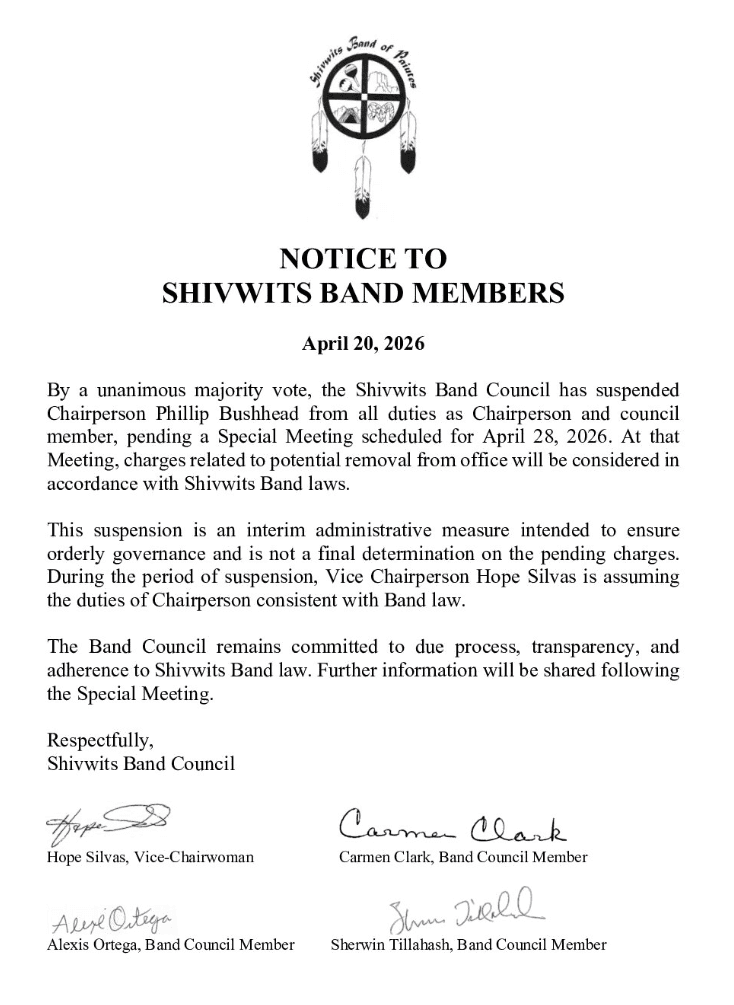 By a unanimous majority vote, the Shivwits Band Council has suspended Chairperson Phillip Bushhead from all duties as Chairperson and council member, pending a Special Meeting scheduled for April 28, 2026. At that Meeting, charges related to potential removal from office will be considered in accordance with Shivwits Band laws.
